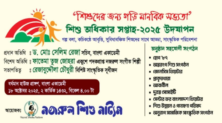 ‘শিশুদের জন্য গড়ি মানবিক সভ্যতা’ প্রতিপাদ্যকে সামনে শিশু অধিকার সপ্তাহ-২০২৫ উদযাপন উপলক্ষে ‘নজরুল শিশু নাট্যম’ এর এক সচেতনতামূলক অনুষ্ঠান বাংলা একাডেমির বর্ধমান হাউজে শনিবার বিকেল ৪.০০ টায় অনুষ্ঠিত হবে।