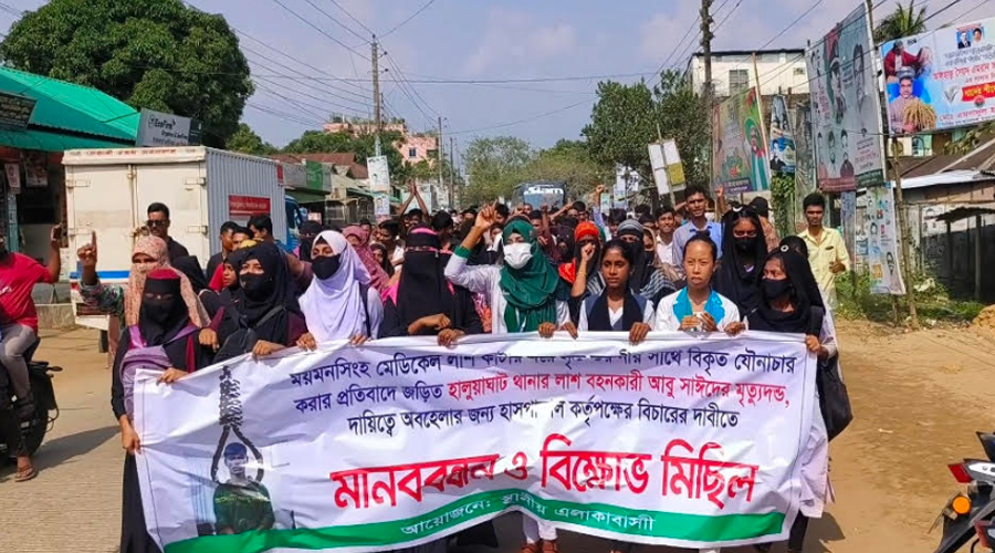 ময়মনসিংহের হালুয়াঘাটে, ময়মনসিংহ মেডিক্যাল কলেজ হাসপাতালের মর্গে এক মৃত তরুণীর সঙ্গে বিকৃত যৌনাচারের প্রতিবাদে হালুয়াঘাটে মানববন্ধন ও বিক্ষোভ মিছিল করেছেন শিক্ষার্থীরা। বৃহস্পতিবার (২৩ অক্টোবর) দুপুরে উপজেলার কেন্দ্রীয় শহীদ মিনারে এ মানববন্ধন অনুষ্ঠিত হয়।