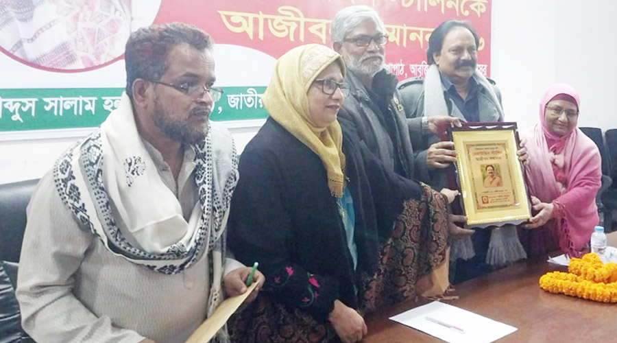 আনুষ্ঠানিকভাবে তাকে প্রদান করা হয় একটি ক্রেস্ট, উত্তরীয়, ব্যাচ এবং নগদ ১০ হাজার টাকার চেক। গতকাল শনিবার (১০ জানুয়ারি) জাতীয় প্রেসক্লাবের আবদুস সালাম হলে সংগঠনের প্রধান উপদেষ্টা কবি ও কথাশিল্পী আরিফ মঈনুদ্দীনের সভাপতিত্বে ও প্রতিষ্ঠাতা নির্বাহী সভাপতি কবি কথাশিল্পী ও পুঁথিসম্রাট জালাল খান ইউসুফীর উপস্থাপনায় অনুষ্ঠানে সম্মানিত অতিথি হিসেবে উপস্থিত ছিলেন, সাবেক রাষ্ট্রদূত কবি ও কথাশিল্পী মাজেদা রফিকুন নেছা, দৈনিক নয়াদিগন্তের সাহিত্য সম্পাদক কবি জাকির আবু জাফর, কবি ও সাংবাদিক রফিক হাসান, বাংলা একাডেমির উপপরিচালক গবেষক ড. সাহেদ মন্তাজ, কবি ও অভিনেতা এবিএম সোহেল রশিদ, মাসিক কাব্যকথার সম্পাদক মন্ডলির সভাপতি কবি সুফিয়া বেগম, কবি কামরুজ্জামান, কবি ফরিদুজ্জামান, কবি আসাদ কাজল, ইসলামী লেখক ফোরামের সভাপতি কবি মুনীরুল ইসলাম, ছড়াসাহিত্যিক কবি মালেক মাহমুদ, দৈনিক বিজয় পত্রিকার সম্পাদক কবি সাব্বির আহমেদ সেন্টু, সারেঙ সম্পাদক কবি আবদুর রহমান মল্লিক, মাসিক মুক্তবুলি সম্পাদক কবি রিপন শান। স্বাগত বক্তব্য রাখেন রাখেন সংগঠনের সাধারণ সম্পাদক কথাশিল্পী খন্দকার আতিক, শুভেচ্ছা বক্তব্য উপস্থাপন করেন সাংগঠনিক সম্পাদক কবি শিবির আহমেদ লিটন, আইন বিষয়ক সম্পাদক বিশিষ্ট আইনজীবী কবি শামীমা আক্তার শিউলী, কবি ও সম্পাদক মোহাম্মদ বাদশা গাজী। আবৃত্তি করেন কবি ও আবৃত্তিশিল্পী ইরানী সুলতানা, মুশফিকা আলম। সংগীত পরিবেশন করেন কবি ও কণ্ঠশিল্পী সালমান ফারসী, কবি রহমতউল্লাহ।