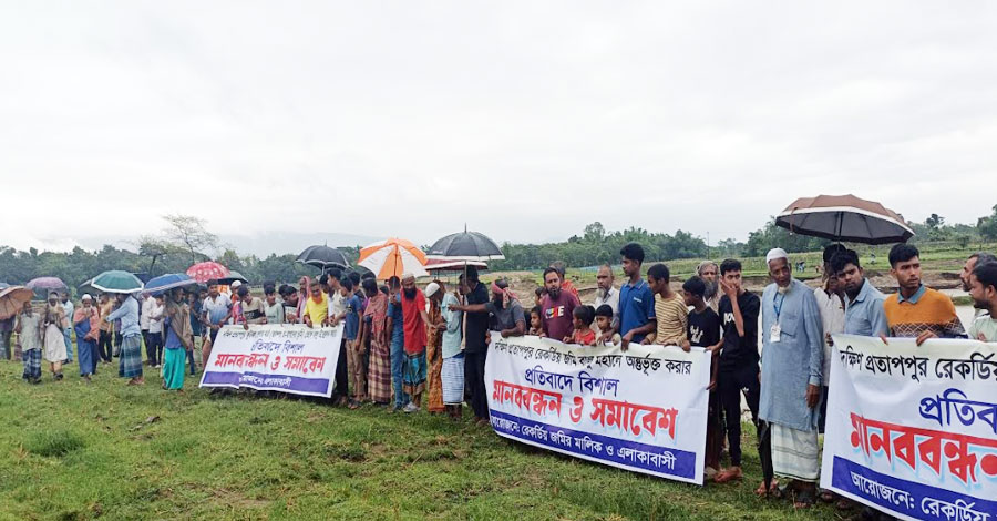 সিলেটের গোয়াইনঘাট উপজেলার দক্ষিণ প্রতাপপুরে খেলার মাঠ ও স্থানীয় এলাকাবাসী রেকর্ডীয় জমি রক্ষার দাবিতে মানববন্ধন ও সমাবেশ করেছেন উক্ত জমির মালিক ও স্থানীয় এলাকাবাসী। সোমবার দুপুরে উপজেলার দক্ষিণ প্রতাপপুর এলাকায় আয়োজিত এই কর্মসূচিতে নারী-পুরুষসহ হাজারো মানুষ অংশ নেন।