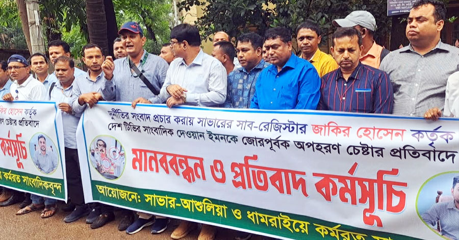 সাভারের সাব-রেজিস্ট্রার জাকির হোসেনের দুর্নীতি নিয়ে সংবাদ প্রচারের জেরে দেশ টিভির স্থানীয় প্রতিনিধি দেওয়ান ইমনের ওপর হামলা এবং অপহরণ চেষ্টার প্রতিবাদে মানববন্ধন ও প্রতিবাদ কর্মসূচি পালন করেছেন সাংবাদিকরা।