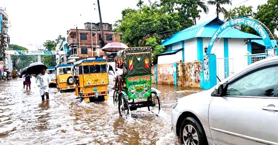 গতকাল রাত থেকে শুরু হওয়া কয়েক দফার ভারী বর্ষণে শহরের অধিকাংশ সড়ক পানির নিচে তলিয়ে যায়। বিশেষ করে সার্কিট হাউজ রোড, শায়েস্তানগর, কালীবাড়ী ক্রস রোড, শ্যামলী, ঘাটিয়াবাজারসহ গুরুত্বপূর্ণ সড়কগুলোতে হাঁটুসমান পানি জমে যায়। ফলে যান চলাচল ব্যাহত হওয়ার পাশাপাশি পথচারীদের চরম ভোগান্তিতে পড়তে হয়। অনেক জায়গায় রিকশা ও অটোরিকশা চলাচল বন্ধ হয়ে যায়। স্কুলগামী শিক্ষার্থী ও অফিসমুখী মানুষকে পানির মধ্যে দিয়ে চলাচল করতে দেখা গেছে।